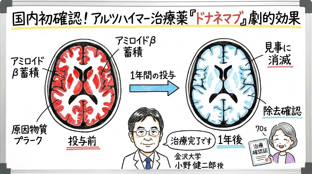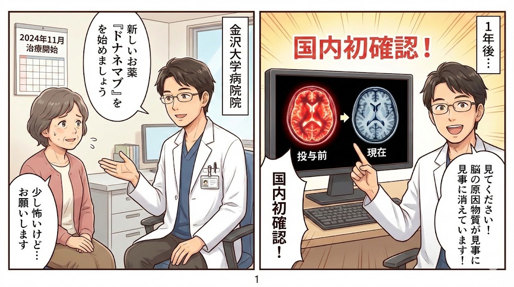金沢大学附属病院では、アルツハイマー病治療薬「ドナネマブ」を国内で初めて患者に投与し、脳内に蓄積していた原因物質であるアミロイドβがほぼ完全に除去されたことが確認されました。