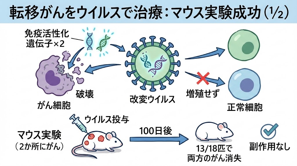 研究チームは、遺伝子を改変したウイルスを使って、転移がんをマウスで治療することに成功したそうです。