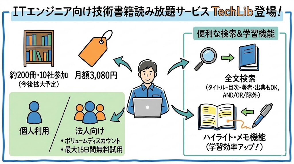 ITエンジニア向けに新たに提供開始された「TechLib」は、10社の出版社が参加し、約200冊の技術書籍がオンラインで読み放題となるサービスだ。