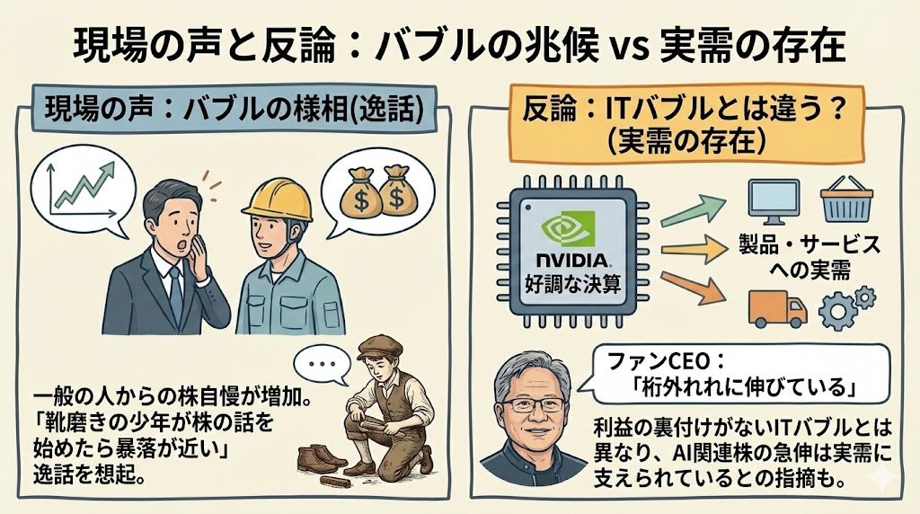 また、金融関係者の間では、技術職の人々まで株の運用成績を語り出すようになったことから、「靴磨きの少年が株の話をし始めたら暴落が近い」という有名な逸話が引き合いに出される場面も散見され、バブル崩壊への懸念が根強い。