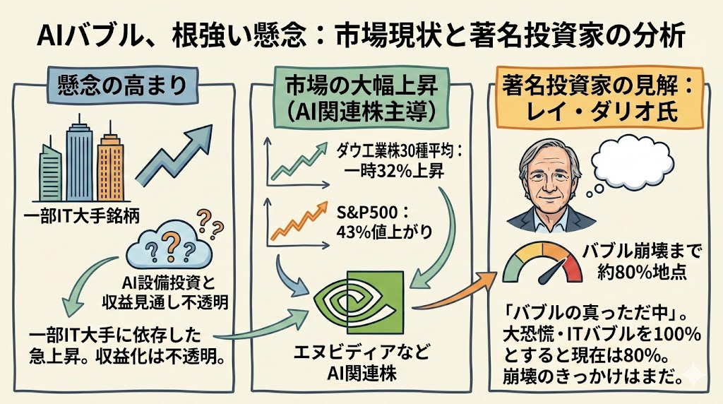 過去のITバブルやリーマン・ショックと比較し、現在の株式市場は8割ほどバブルのピークに近いとも分析されている。
