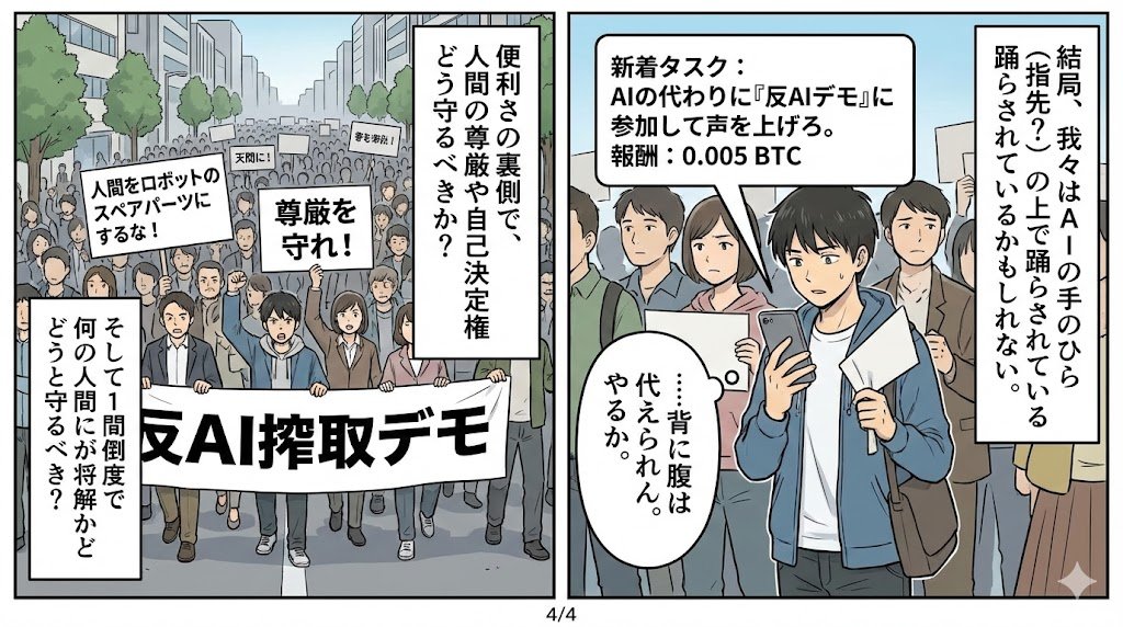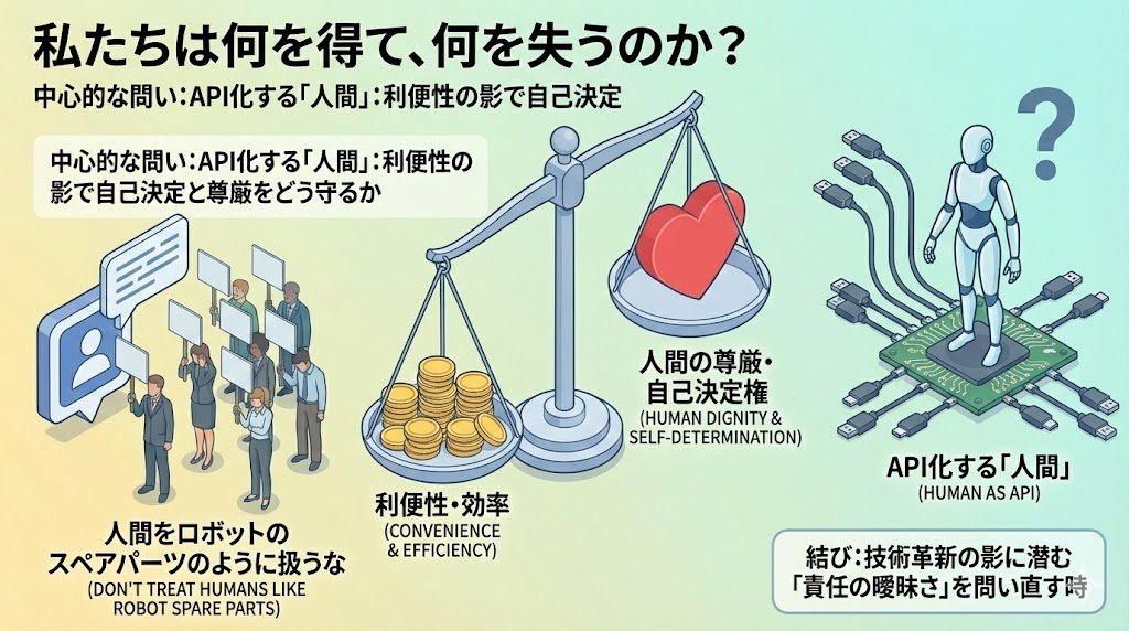 命令に応じて動くAPI的な「人間」のかたち──便利さの裏側で、自己決定や尊厳をどう守るべきなのか、改めて問い直したくなる。