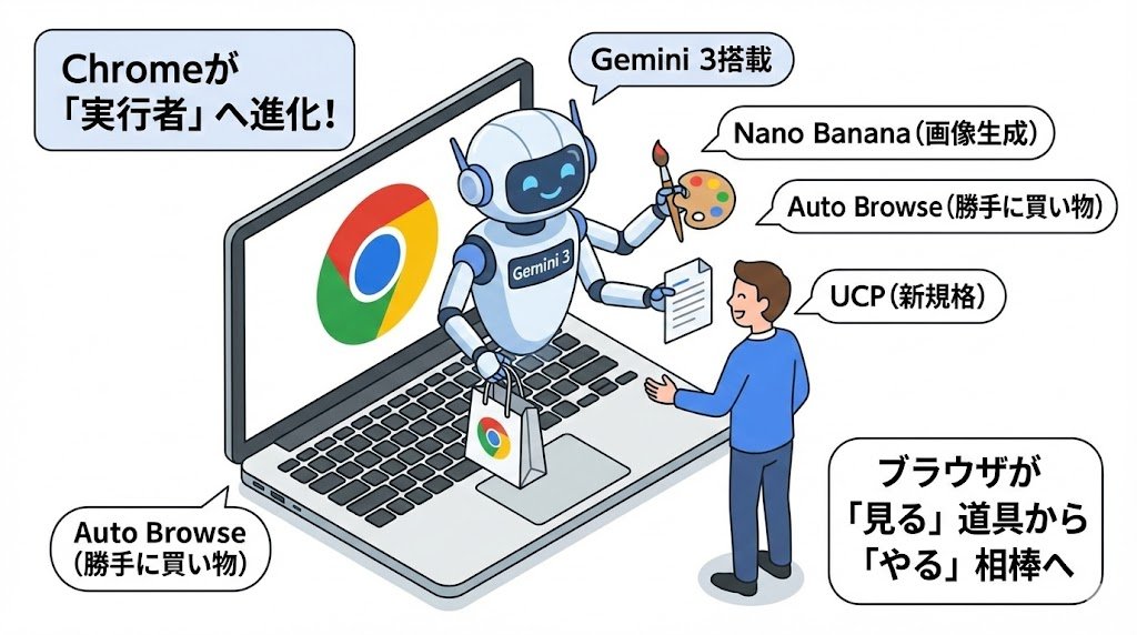 GoogleがGemini 3というAIをコアに据えたことで、ブラウザはもはや「ただの閲覧ツール」から、「何かを主体的に実行するエージェント」に化けつつある。