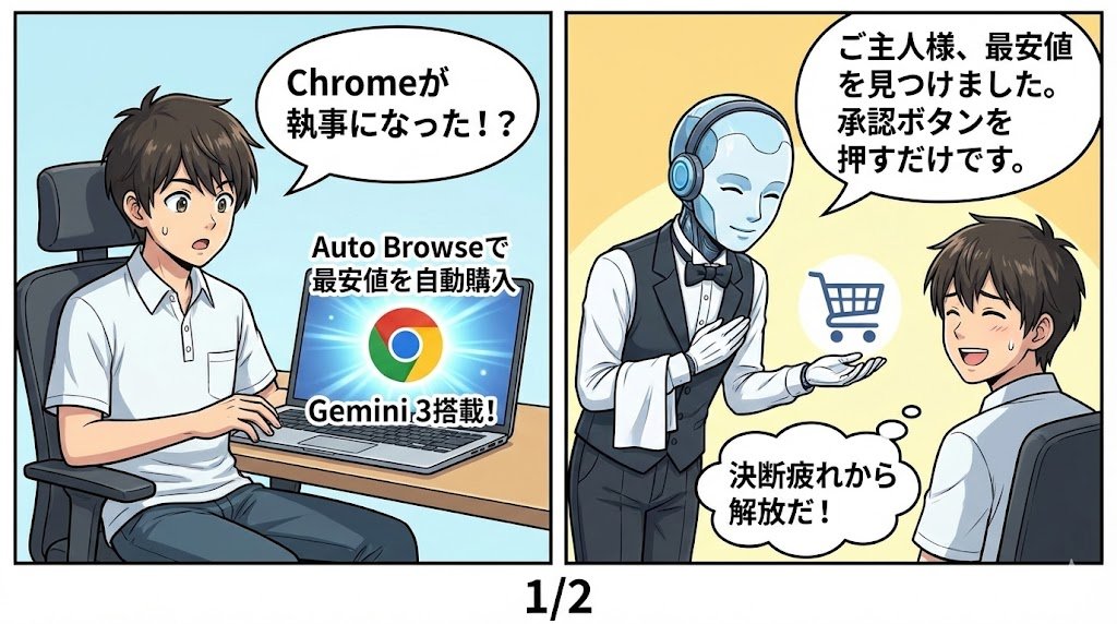とくに注目なのは、米国中心で展開中の自律型AI「Auto Browse」や、各種ネットショップを横断し「最安値」を探してカート投入から決済直前まで自動で代行するUniversal Commerce Protocol(UCP)のような仕組み。