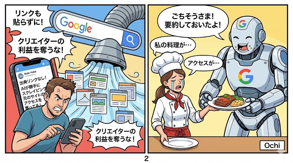この出来事は、Googleが自社のAI開発の中で独占的な地位を利用して、Webサイト制作者の労力や収益を奪いながら、AIによる要約コンテンツを再公開していることへの懸念につながっています。