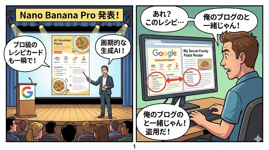 12月1日、GoogleがAIを使って作成したレシピ用インフォグラフィック画像が、個人ブログサイトからの無断転載を含んでいたことが指摘され、大きな話題となりました。