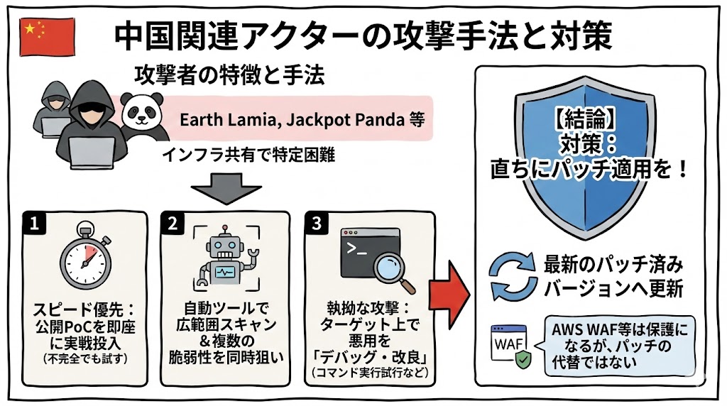 Amazonのインテリジェンスチームなども早い段階で状況を監視しており、Earth LamiaやJackpot Pandaといった複数の中国関連グループによる攻撃が観測された。